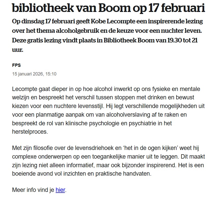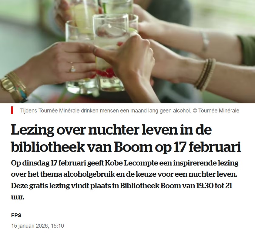 Op Kobe Lecompte zijn verjaardag (17 februari) trekt hij naar Boom (Antwerpen) voor de lezing Kiezen voor een nuchter leven. Welkom!